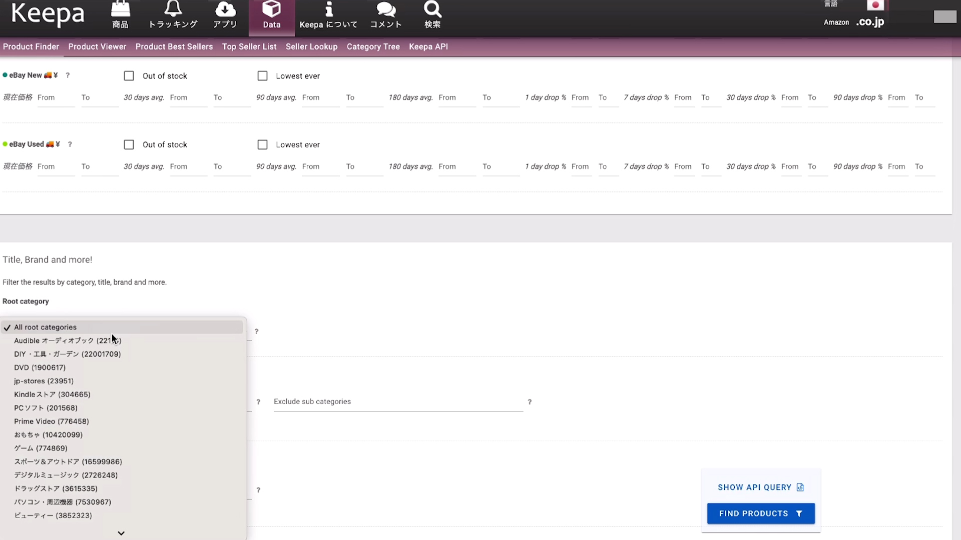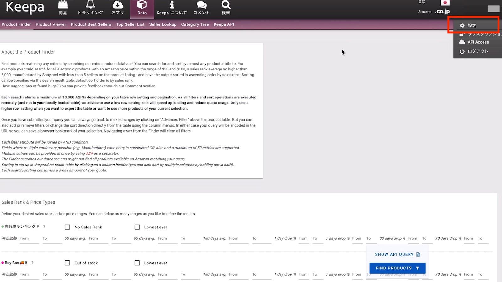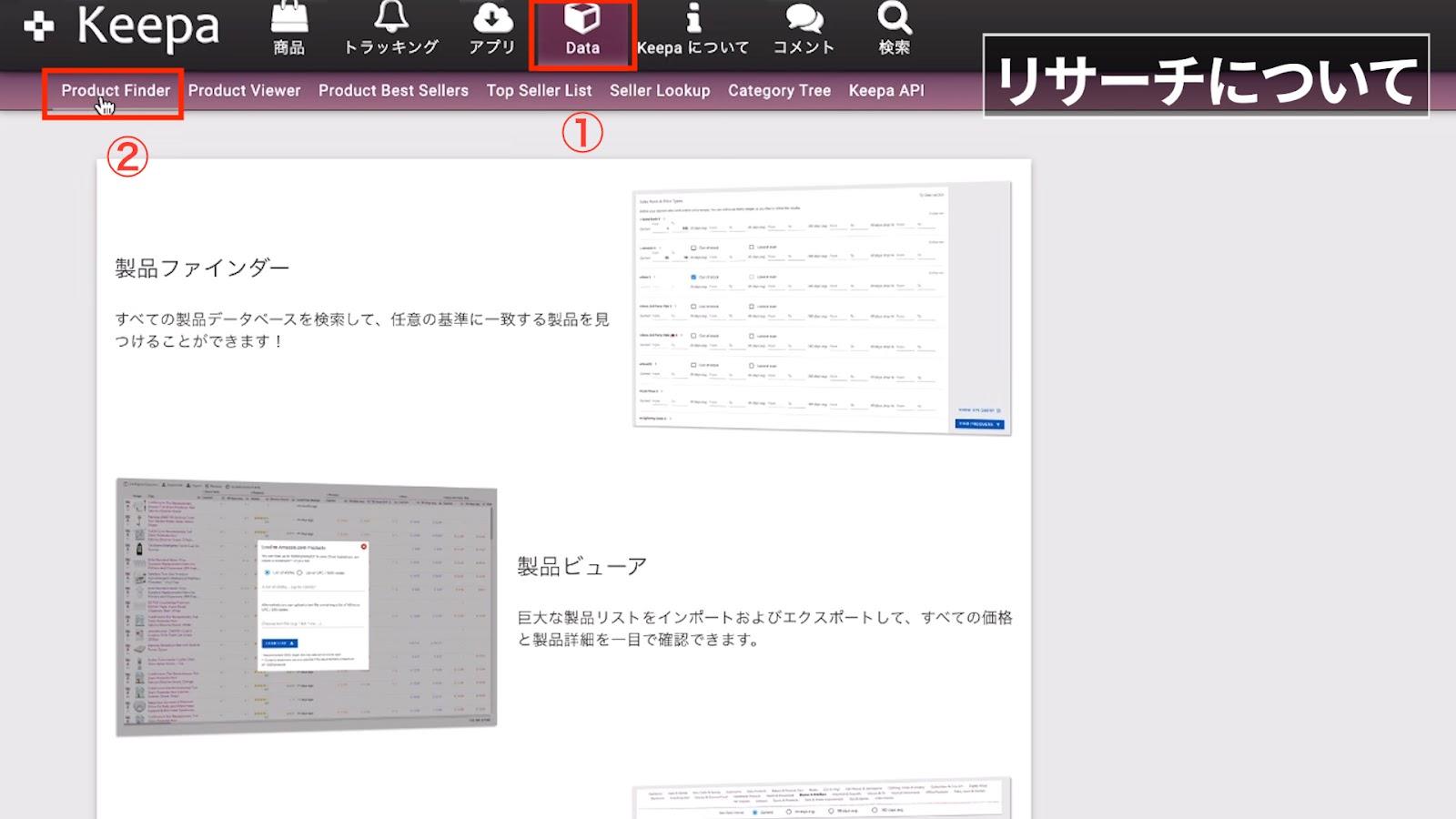 リサーチ自体は「①Data」の「②Product Finder」から行います。