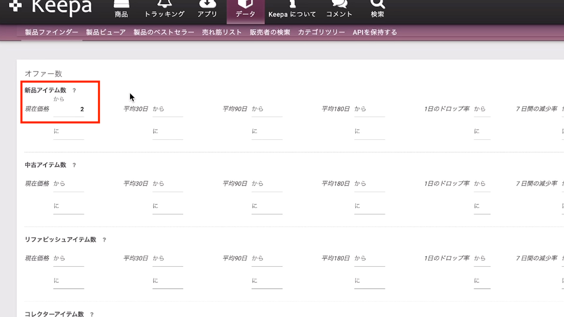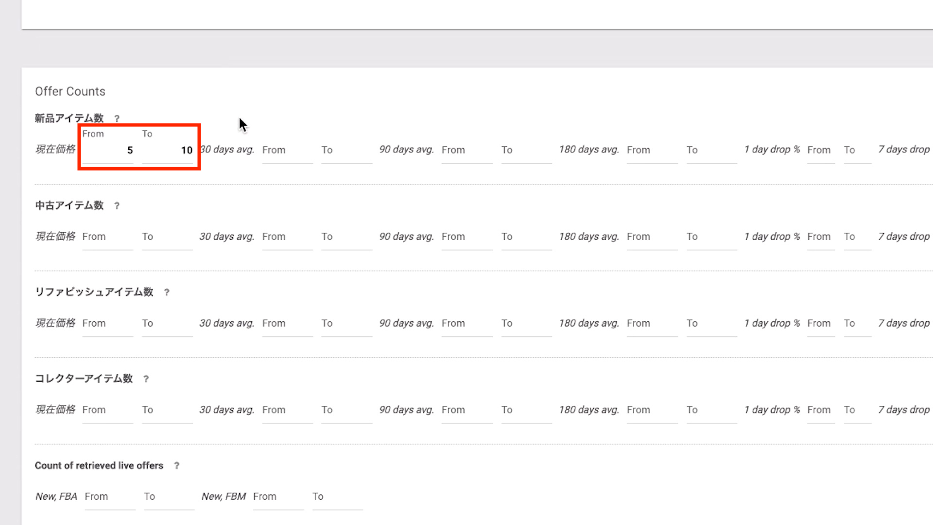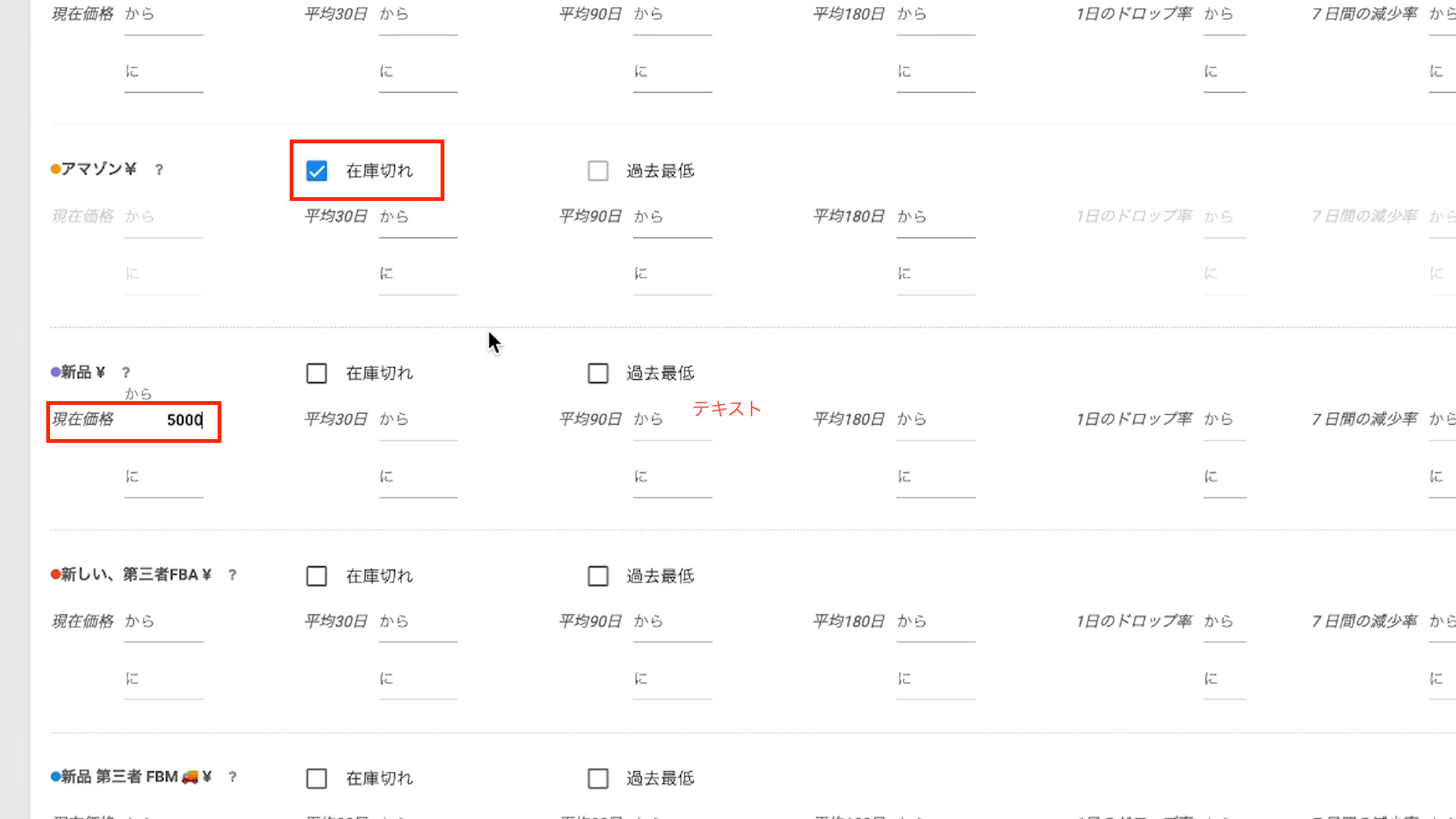 新品の出品者の価格を設定してリサーチします。
