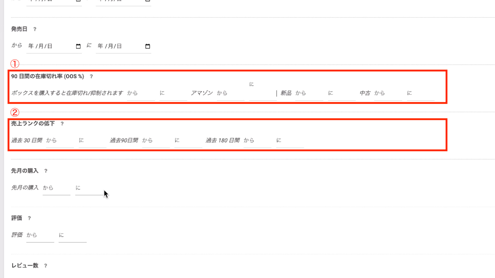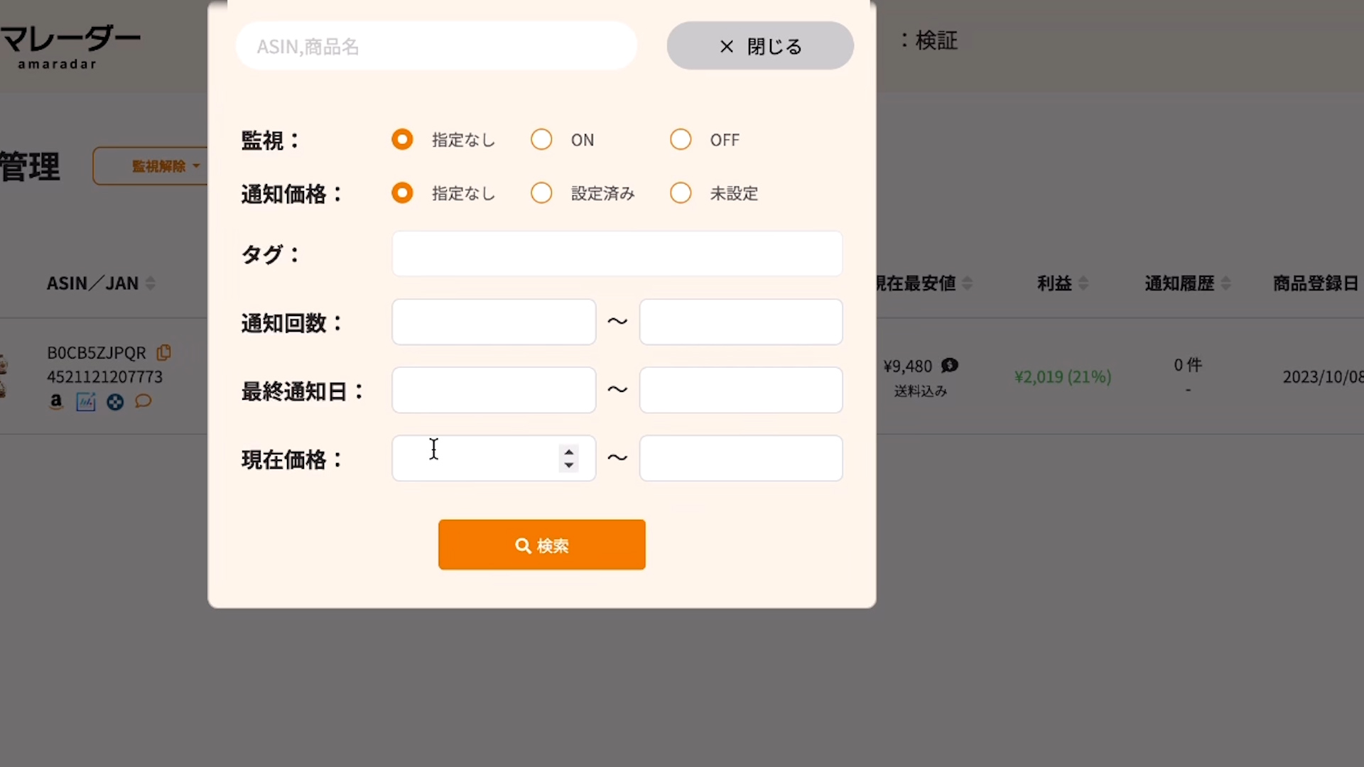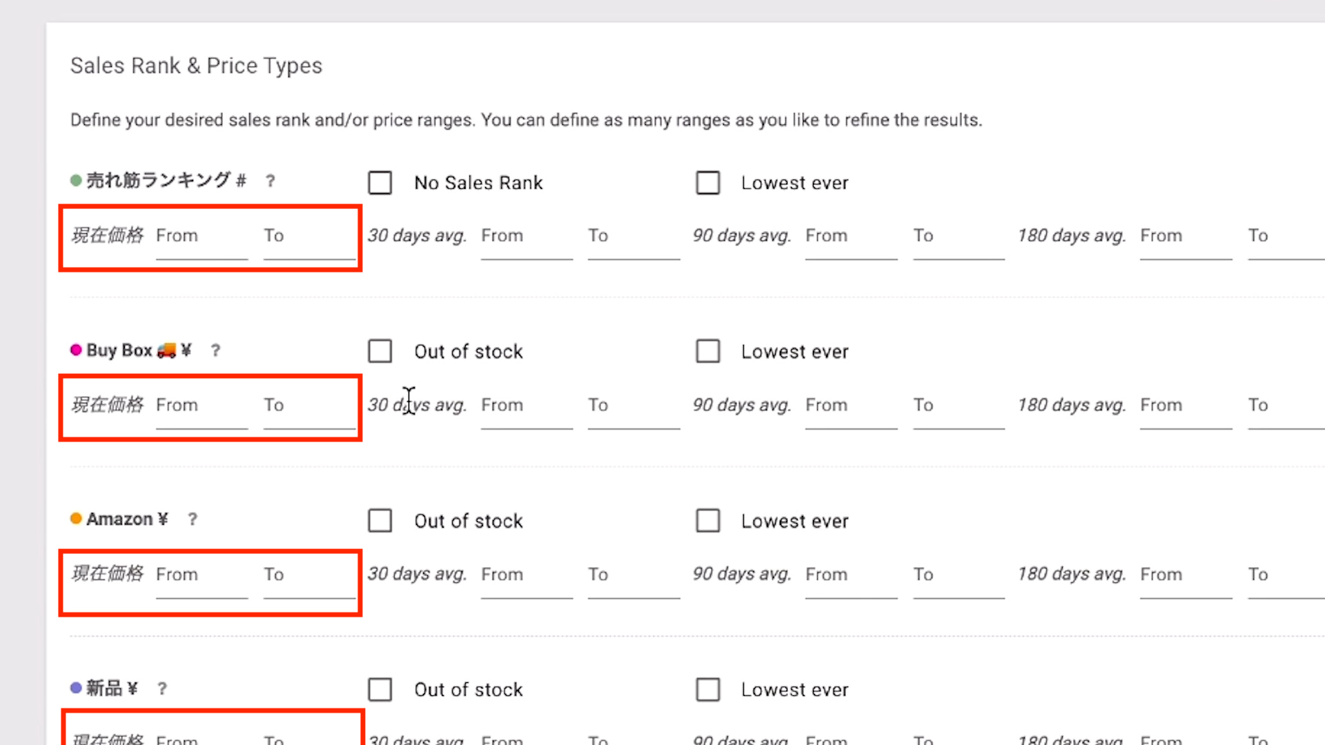 新品の出品者の価格を設定してリサーチします。