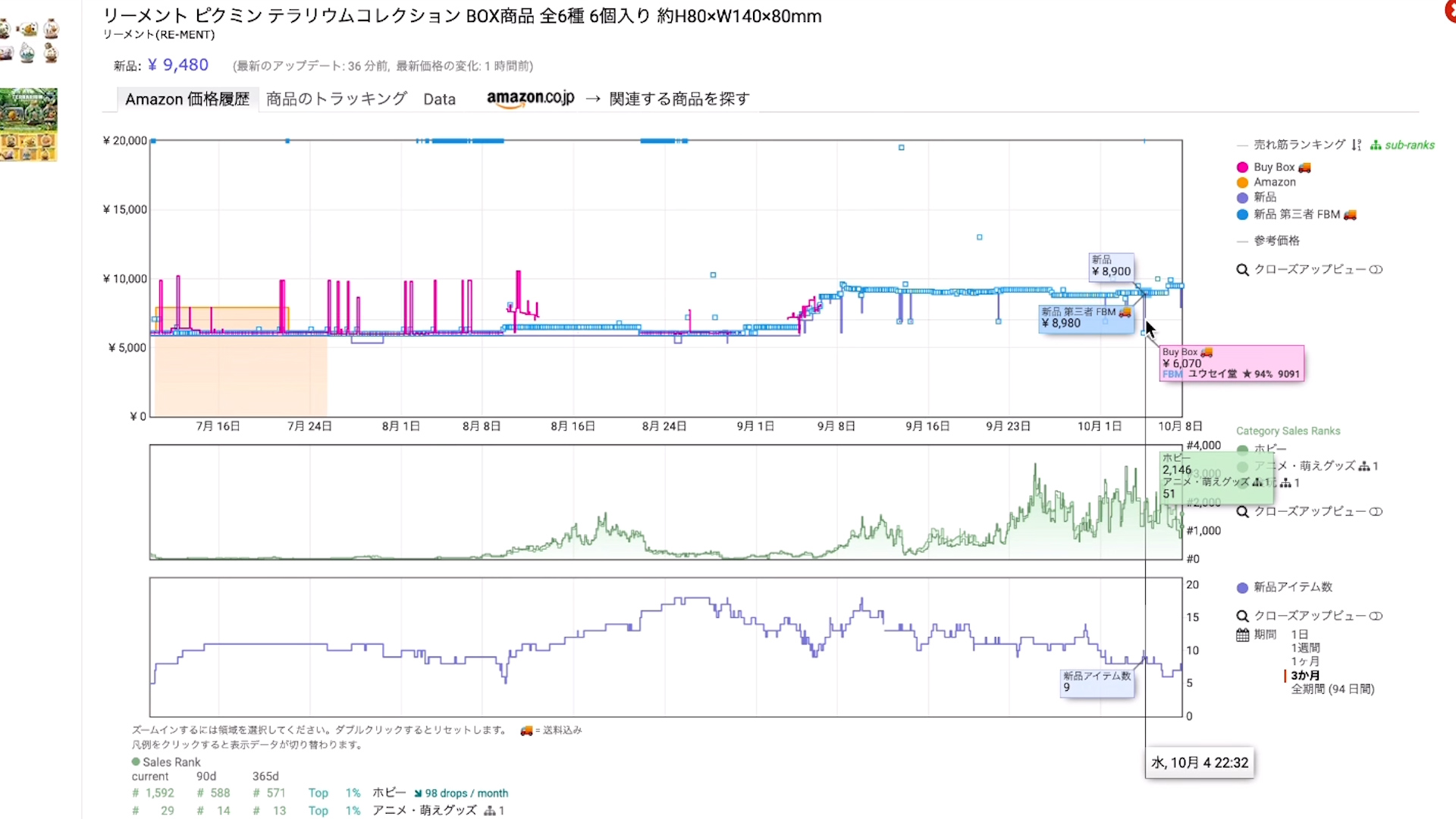 一応ランキングもギザギザしていて出品者数もギザギザしているので、売れている状態かつ差額もあるので利益率が20%弱ぐらいは取れそうです。