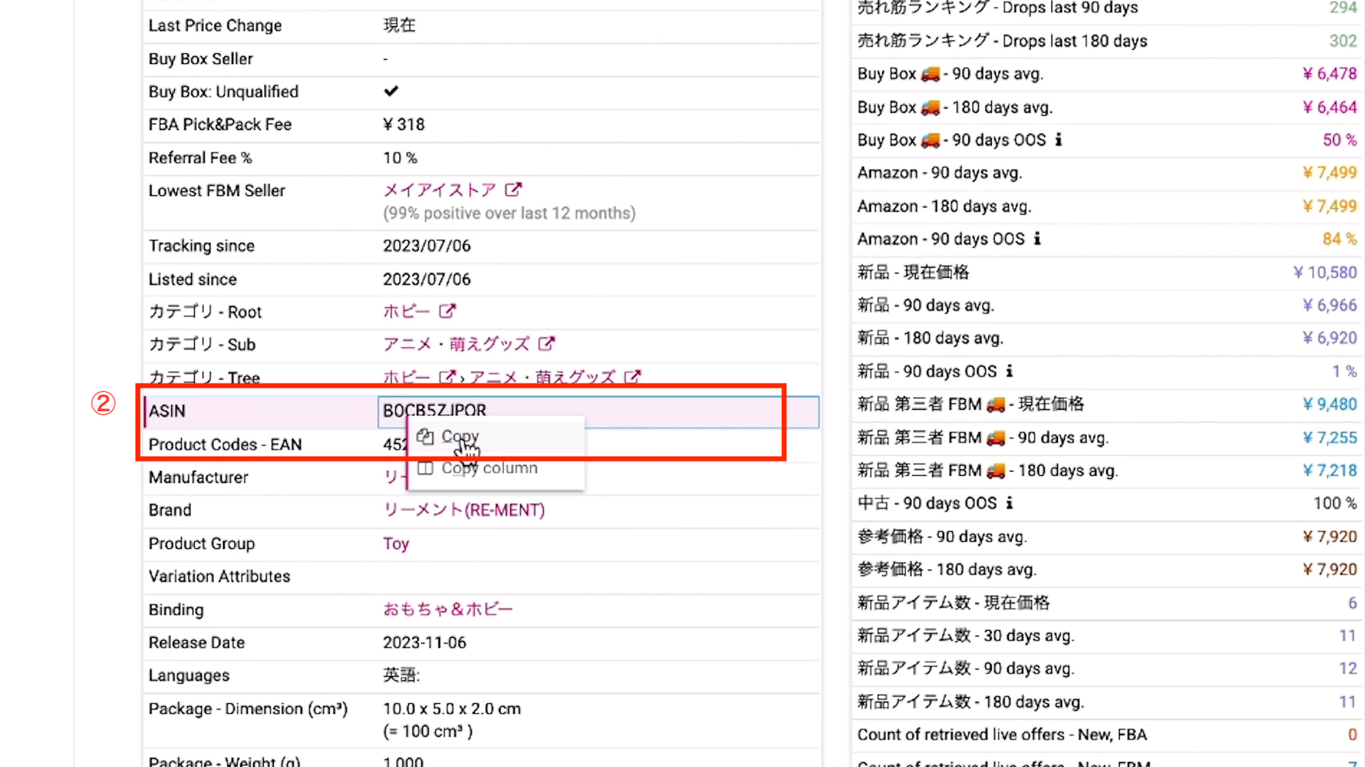 ②ASINをコピー