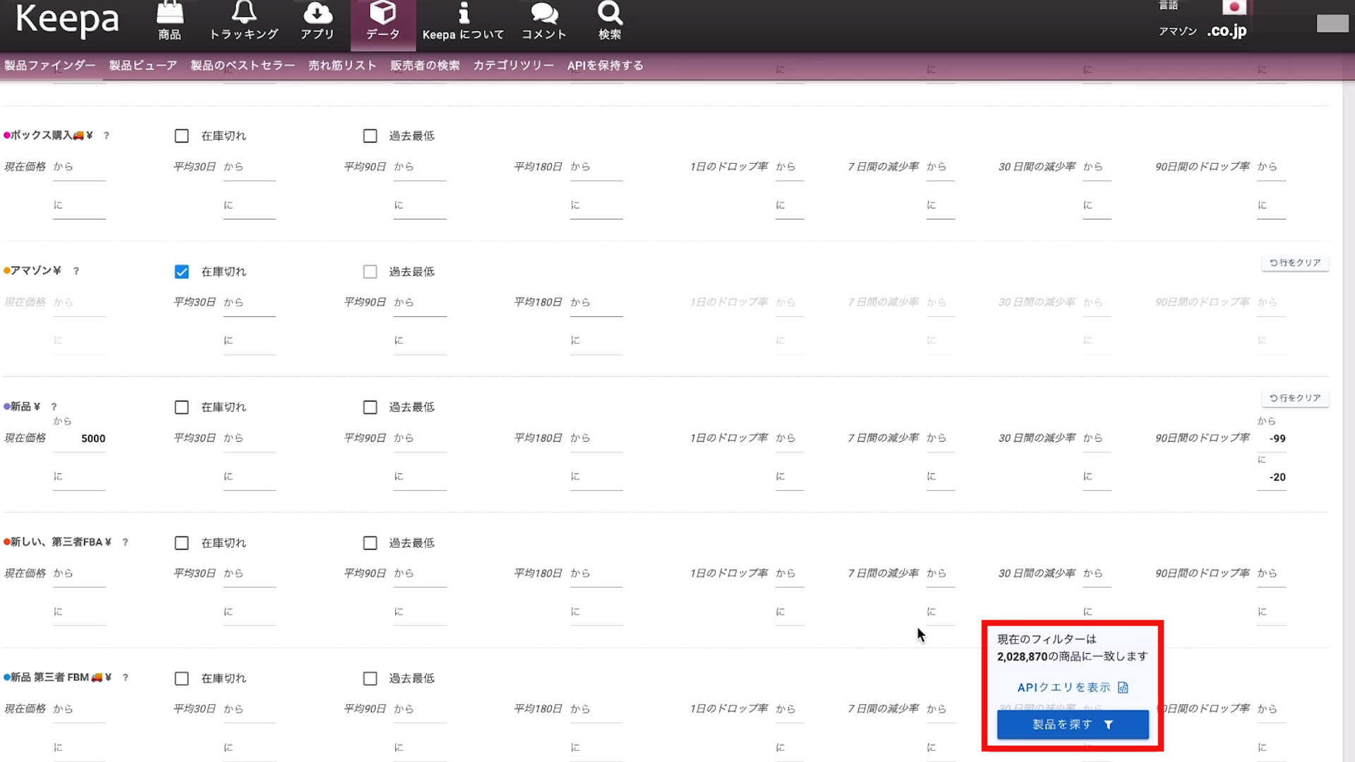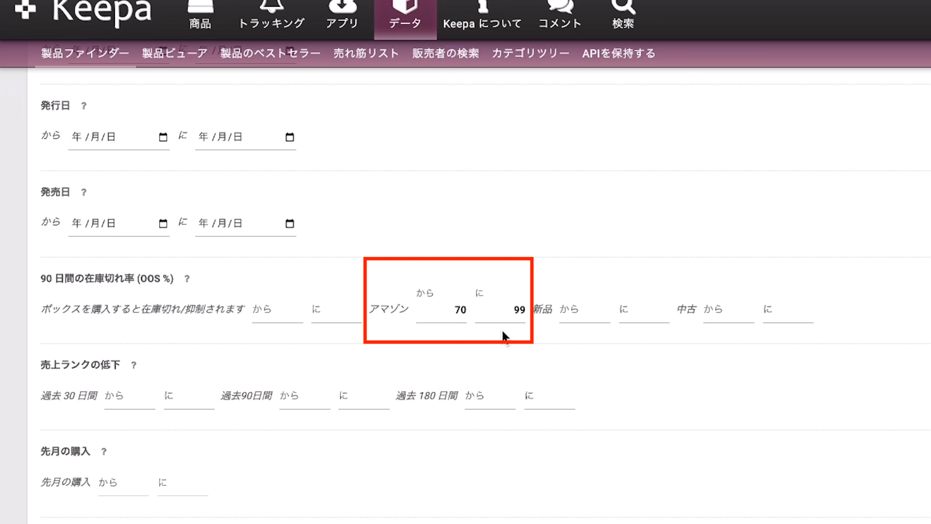 「Amazon本体が在庫切れかつ直近で70%から99%」に設定します。これで直近3ヶ月間の期間でAmazon本体が70%から99%在庫切れを起こしている商品をヒットします。