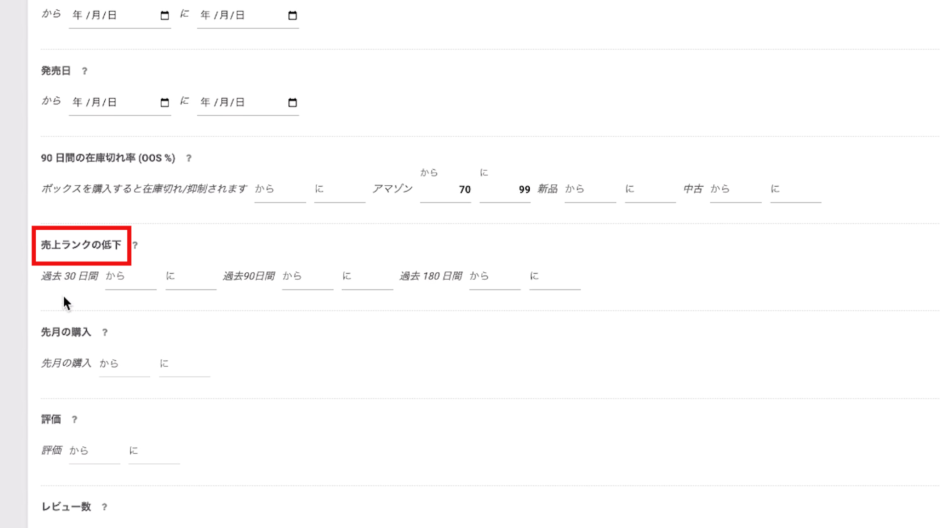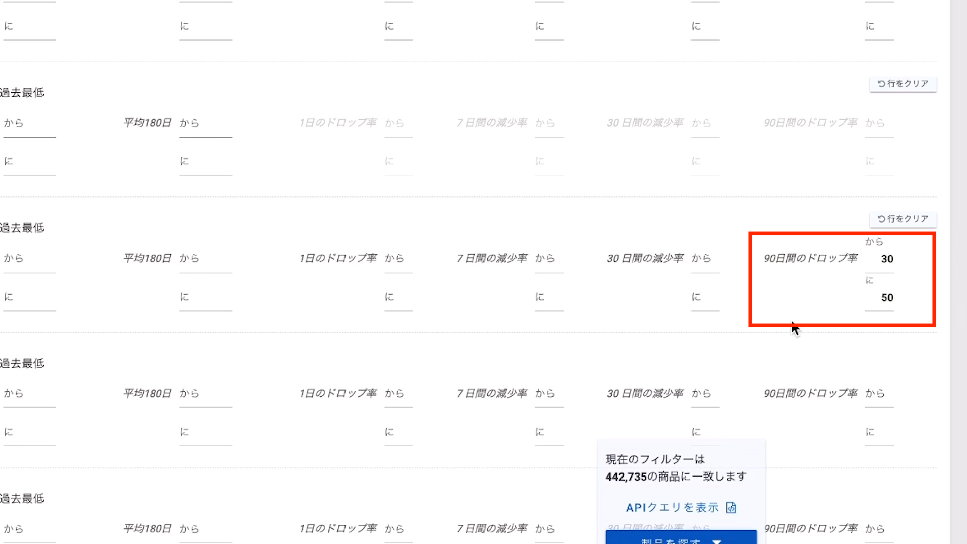 例えば上の写真のように30〜50にした場合「直近3ヶ月間の期間で30%から50%下落している商品」を検索できます。