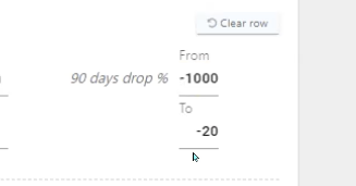 例えば、ここに入れられるのが一番低い数字で-1000になるので、-1000から-20という風に入れると、20%以上上昇している商品が抽出されます。