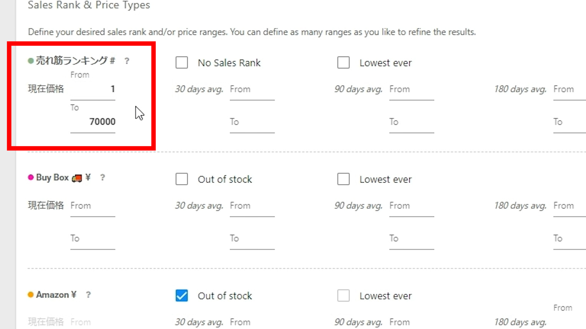 ①「売れ筋ランキング」です。出品者無しのためランキングが下がってることが多いため1〜70,000位の間にしています。