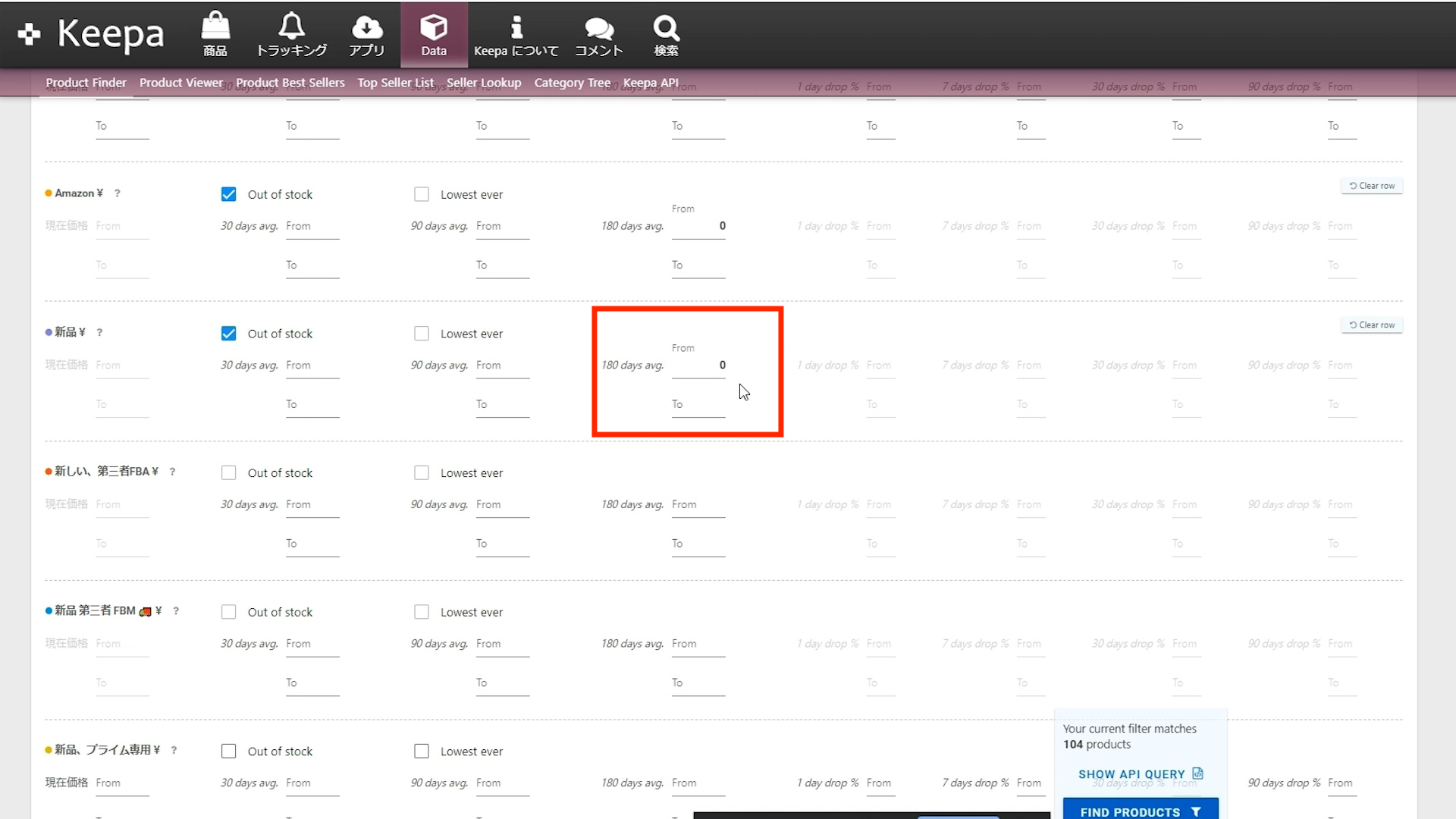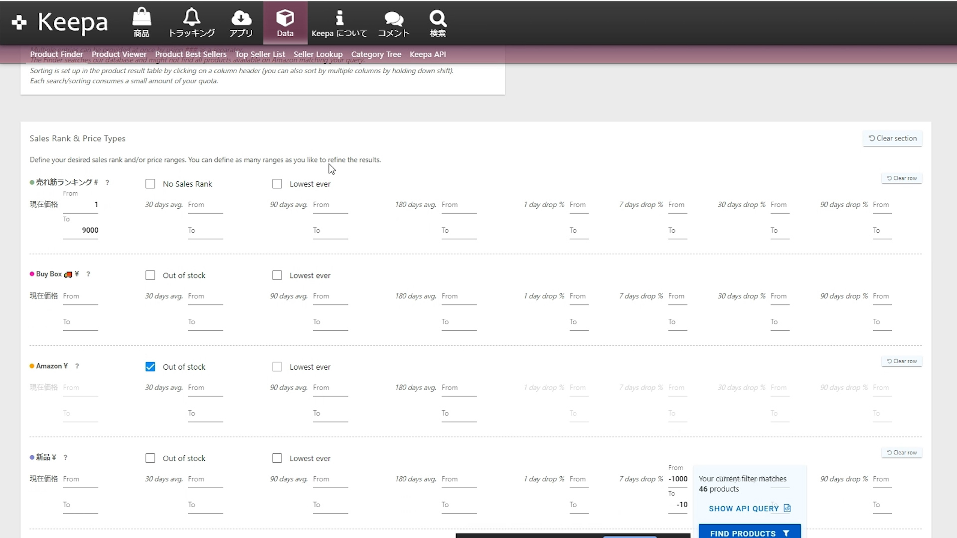 「Out of stock」にチェックを入れると、今Amazonが在庫切れしている商品を抽出できます。