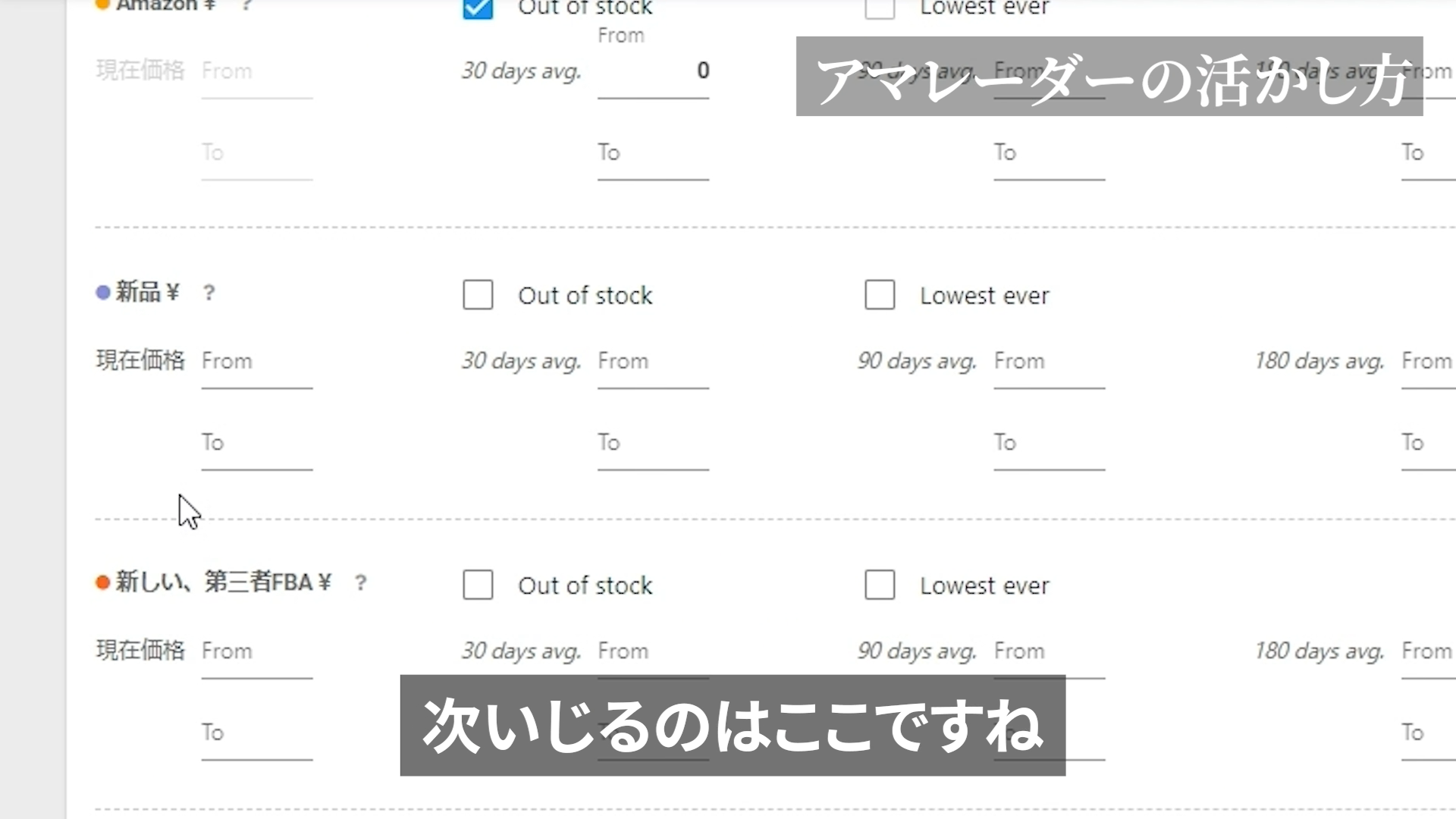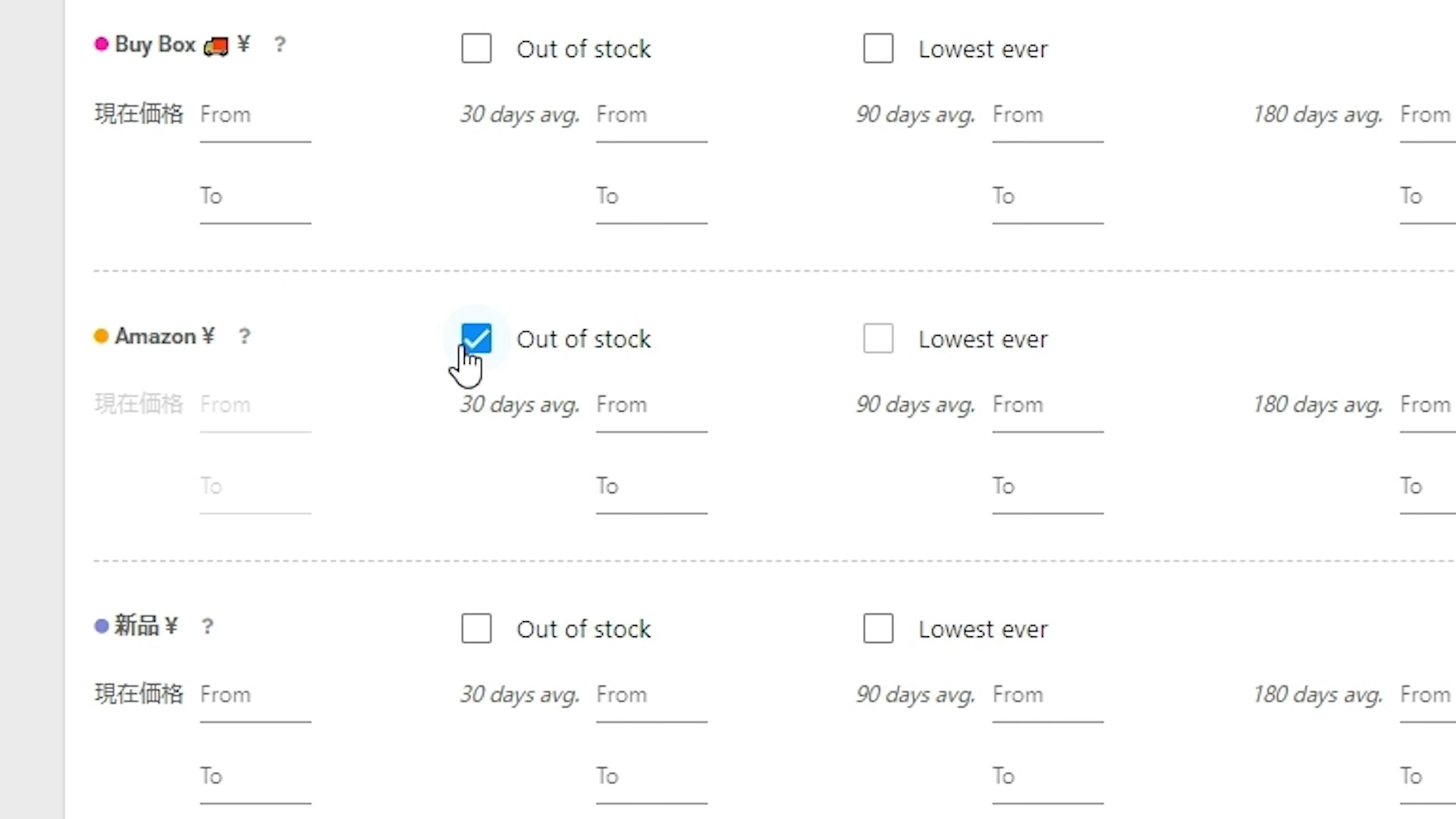 ③あと新品にもAmazonが含まれていますが、ここでも「半年以内に何かしらの値段でいましたよ」という要素を付け加えます。