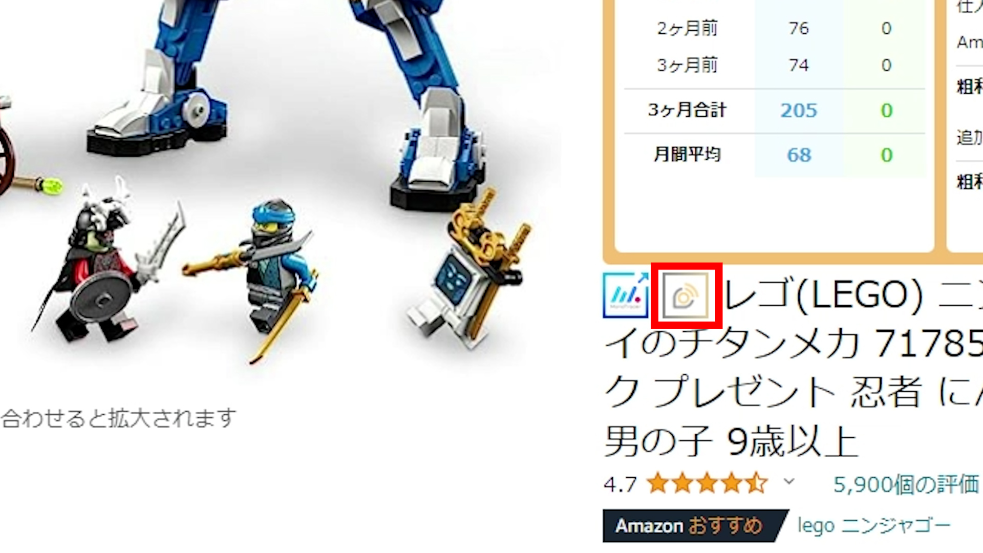 拡張機能を入れると、下記画像のように商品のページを開いた際のタイトル部分にアマレーダーのアイコンが出てきます。