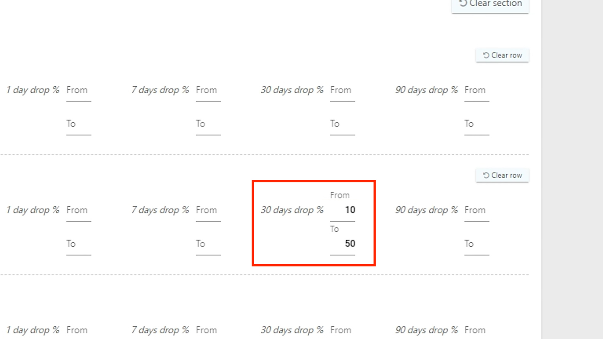 上記の設定にすることで、過去30日間で10%~50%ぐらいまで値下げがあった3,000円~50,000円ぐらいの商品を抽出してくれる設定になります。