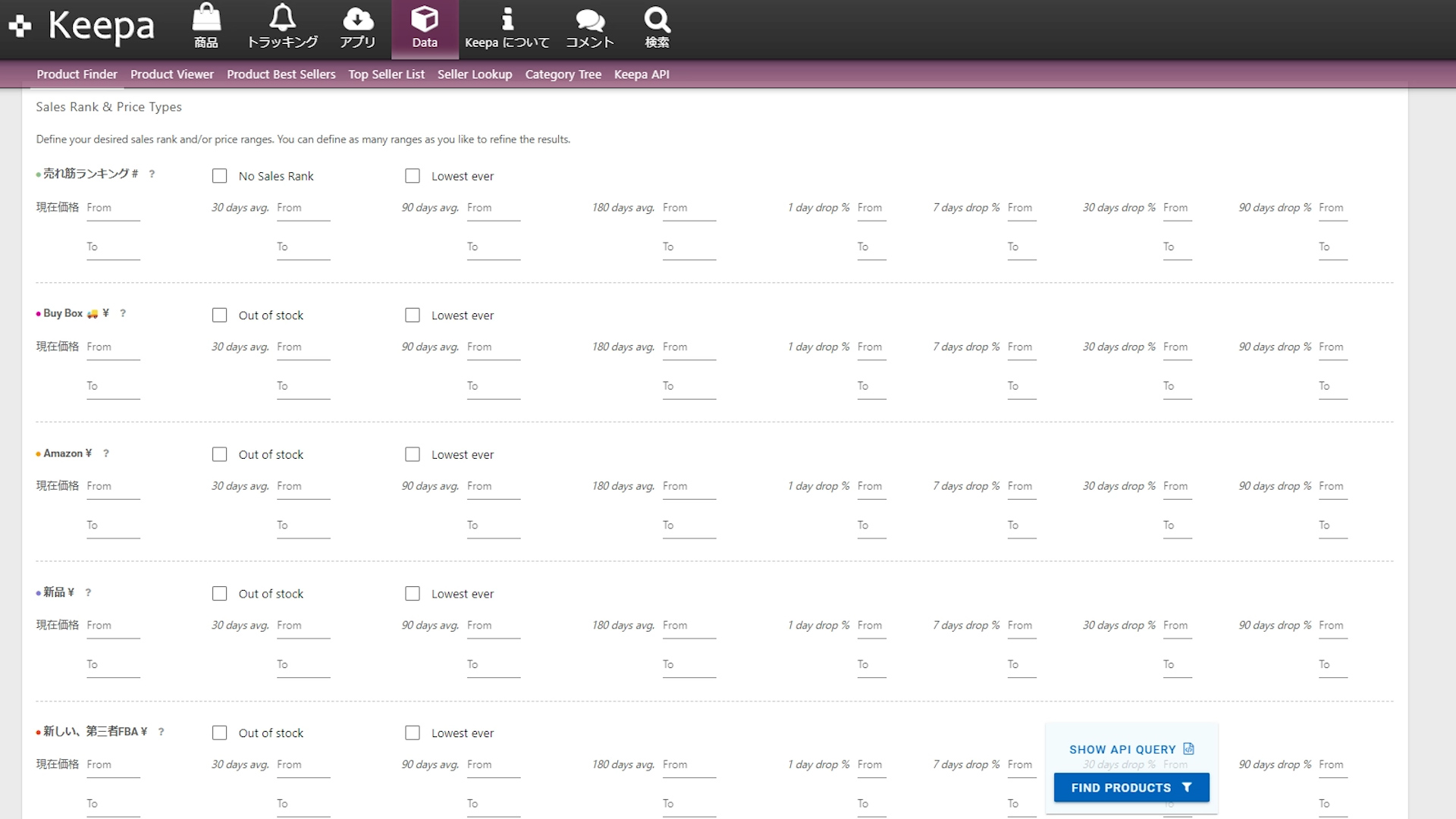 この『Product Finder』を使えば、Amazonが今現在いなくて直近で安い価格での出品があった商品などAmazon刈り取りに適した様々な商品の情報を抽出することが可能です。