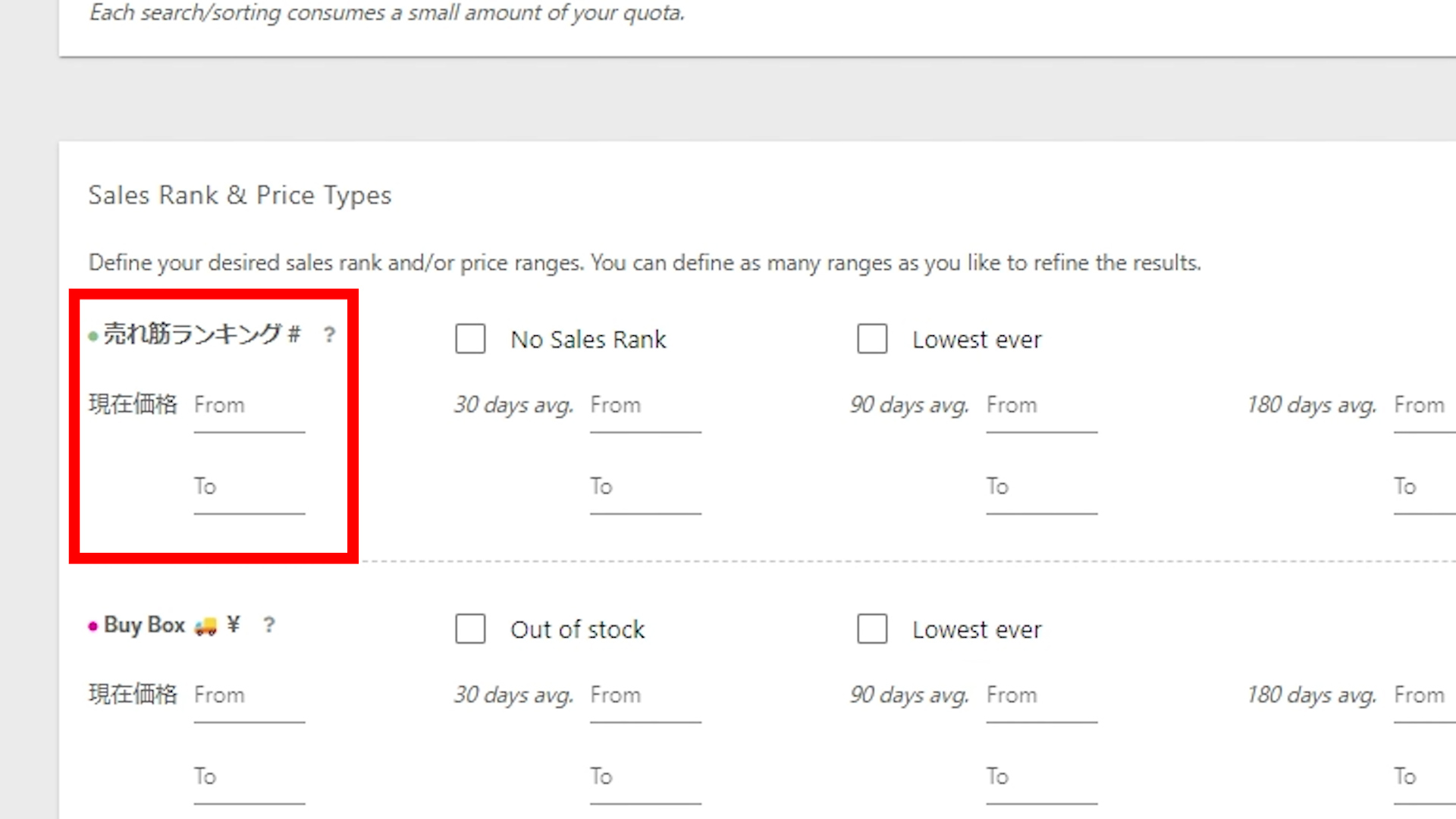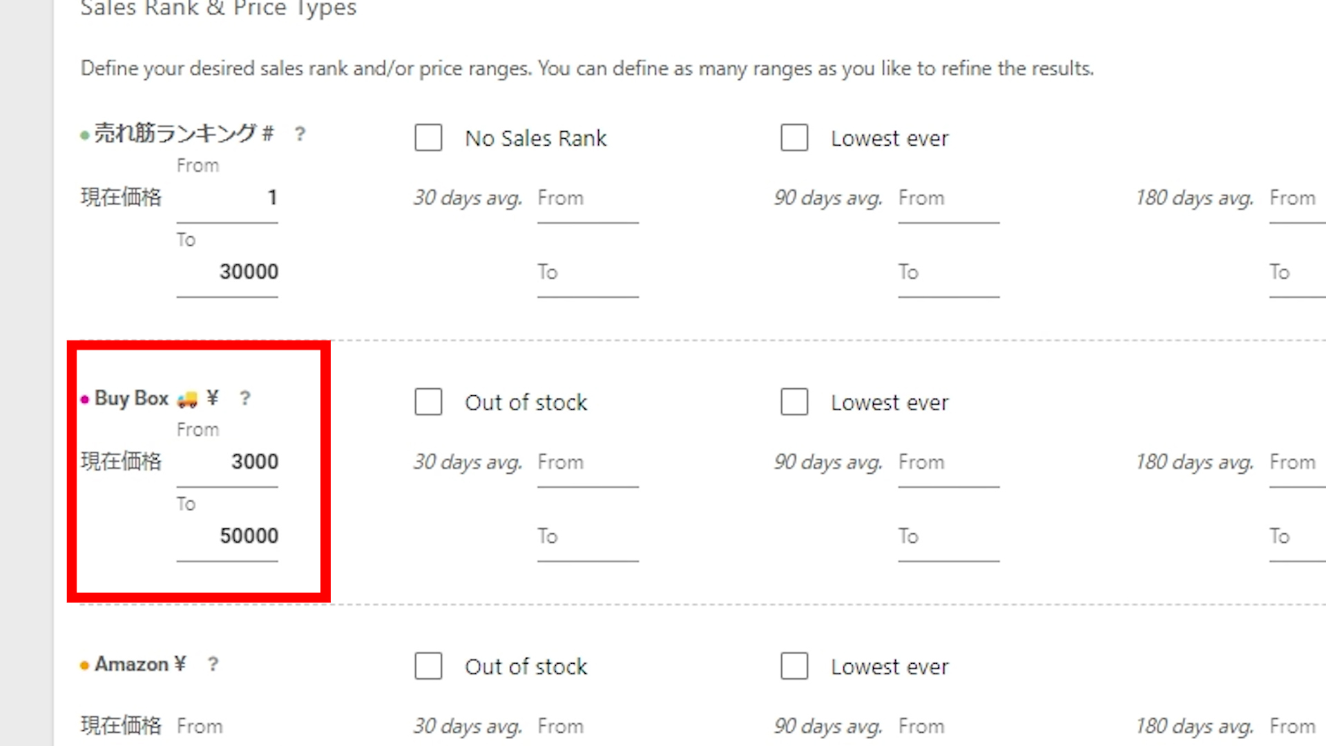 売れ筋ランキングでは売れている商品を調べたいので、1位~30,000位ぐらいまでの商品を設定するようにしてます。