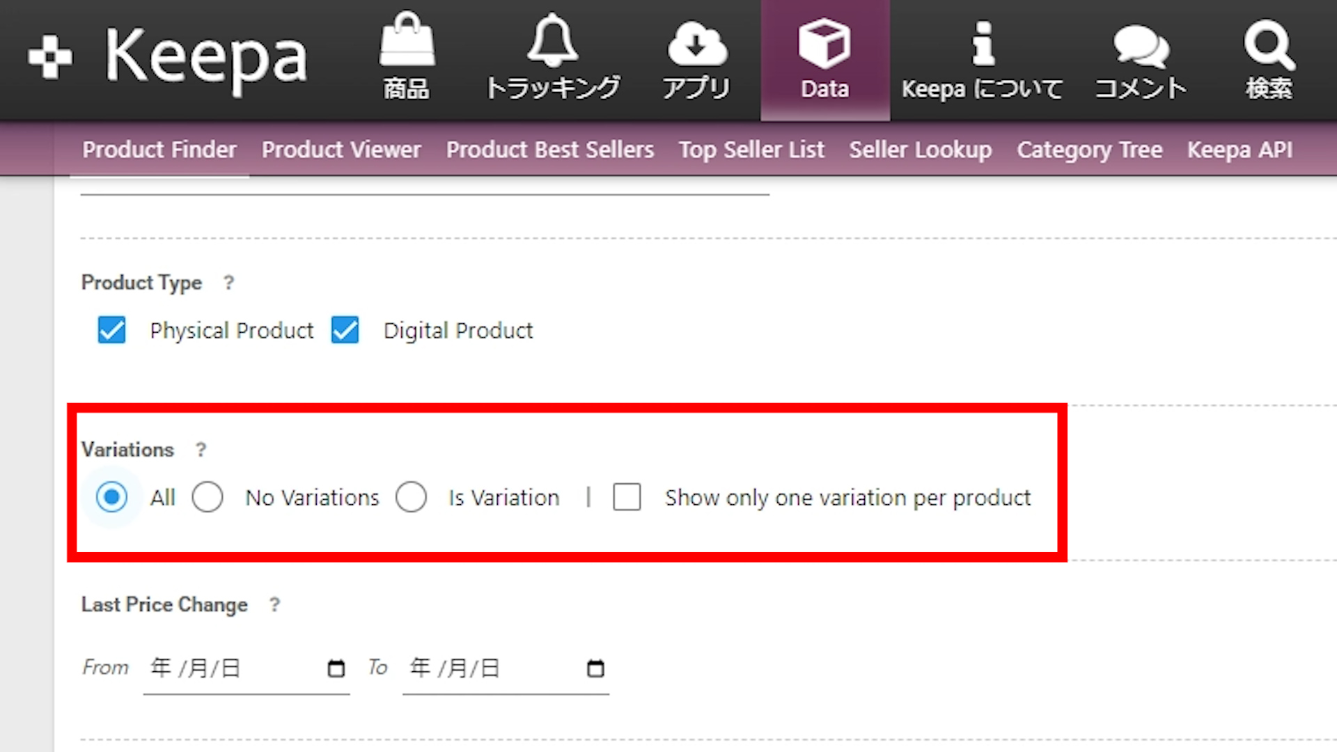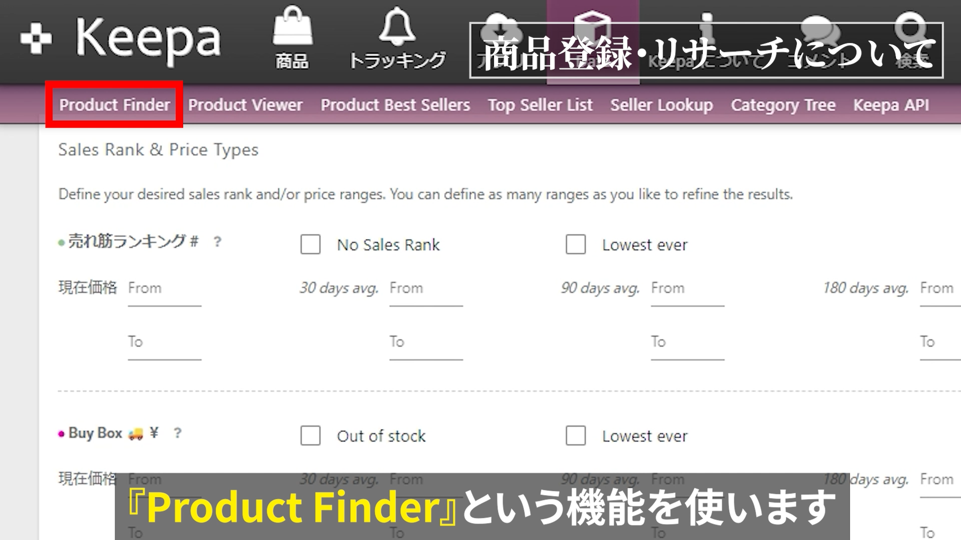 Keepaの『Product Finder』のトップページで項目を順番に設定していきます。