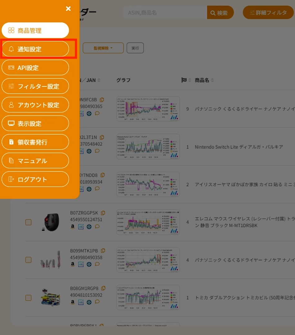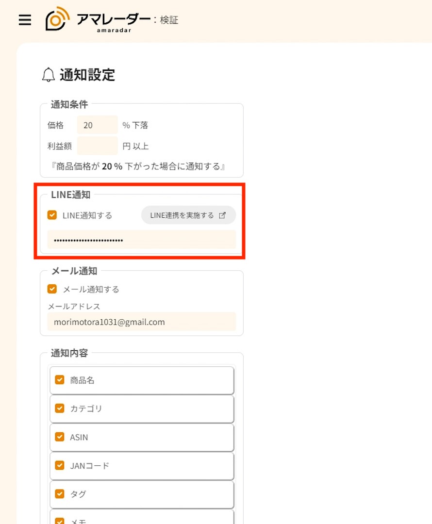 下記の「通知設定」という部分で連携していただくと、LINEでアマレーダーからの通知をもらうことが出来ます。