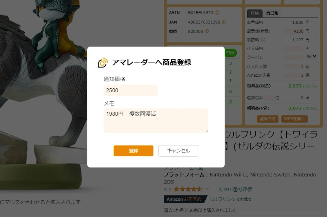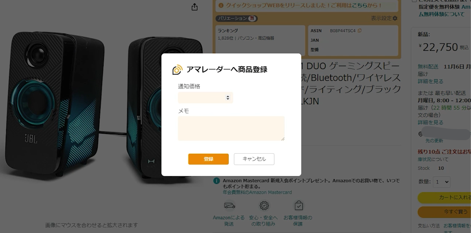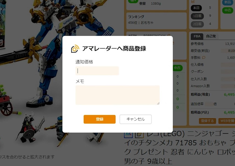 アイコンをクリックして『通知価格』と『メモ欄』を設定して登録というタブを押すと、アマレーダーにそのまま商品を登録することができます。
