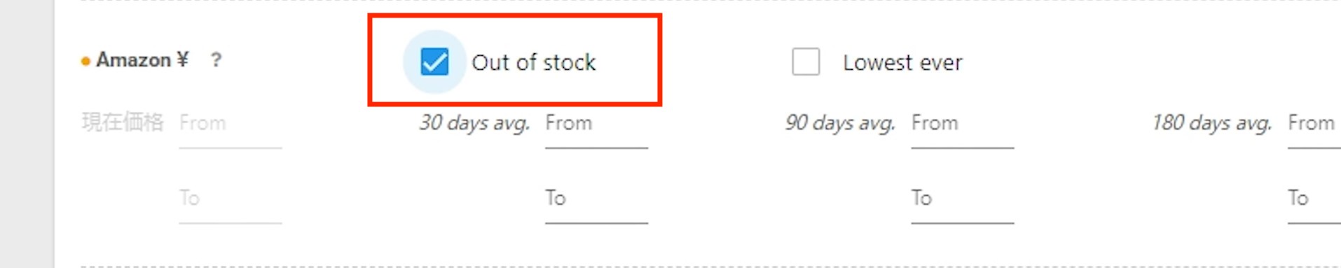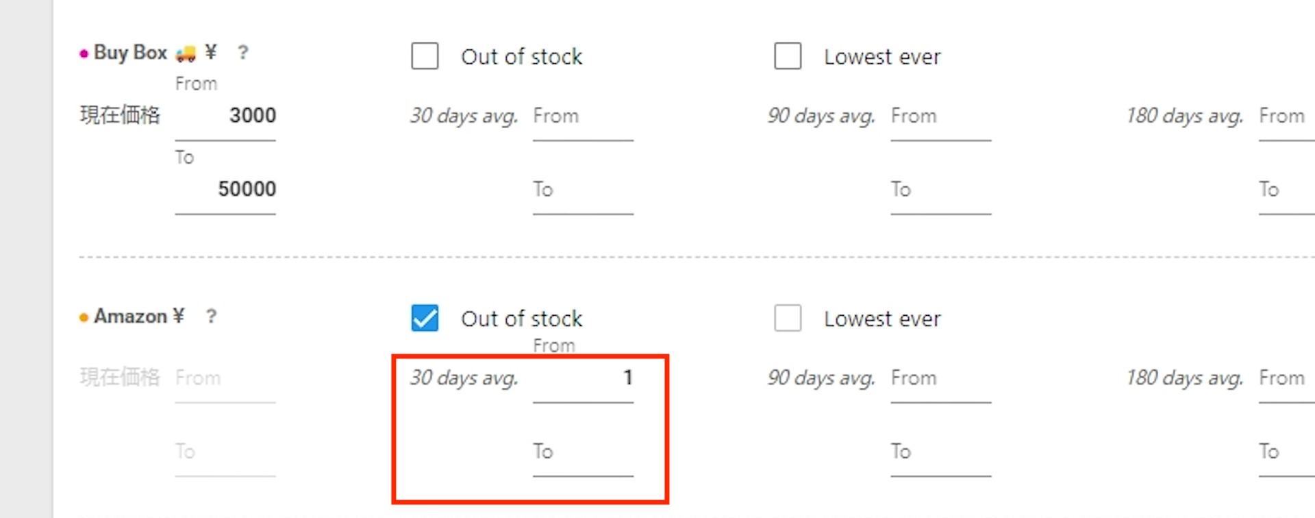 ここに『1』を入れることで、今現在はAmazonの在庫がないけど過去30日間に1回以上Amazonが復活した形跡があるという商品をピックアップしてくれます。
