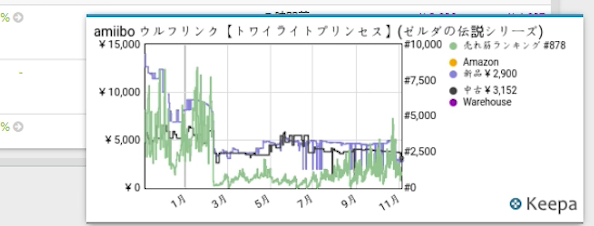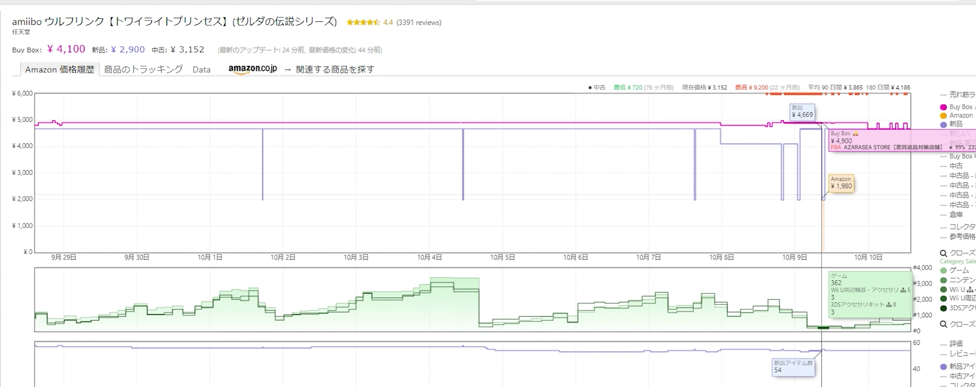 グラフを見ていくとAmazonが1,980円で復活していたり、新品の他の出品者の方が1,980円で何回も出しています。