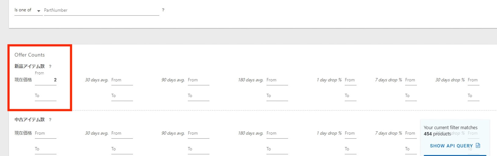仕入れをして実際に販売しようとしたら知的財産権の侵害などで、Amazon・メーカーから注意を受けてしまうような商品が多かったりするため、必ずここの『新品アイテム数』に『2』を入れるようにしています。