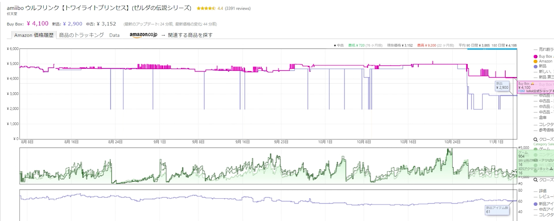 中古のグラフを消して見ると、カート価格は大体4,100円とか高くて5,000円ぐらいかな?ってだけでただ何回か下がっている部分があります。