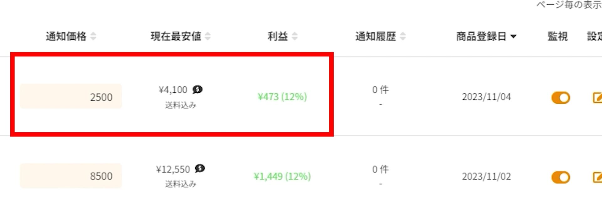アマレーダーの部分をクリックして、通知価格は仕入れをしたい金額1,980円ですが、今現在のカート価格が4,100円なので、そこから考えると2,500円とかで通知が来ても利益が出ます。