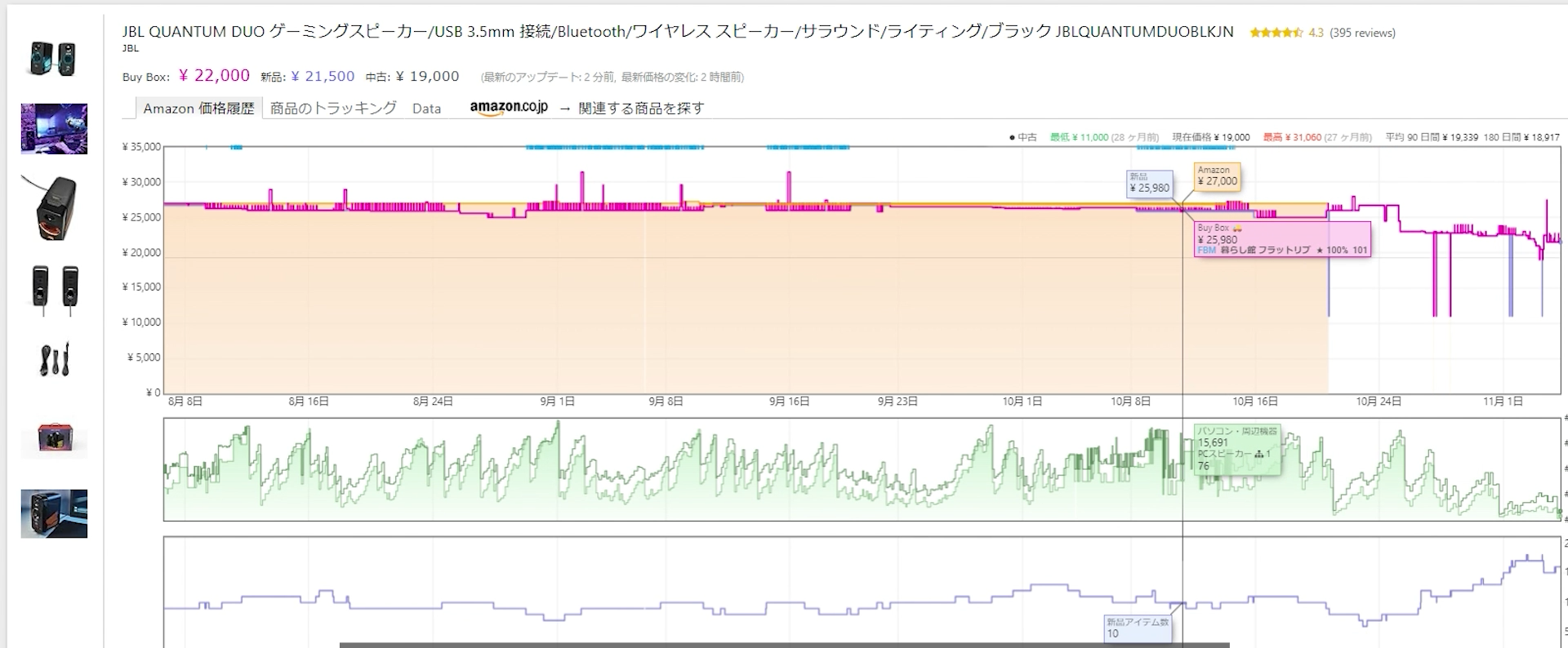 ここ最近、10月20日ぐらいからこんな形で結構Amazon本体が切れて、新品で11,000円くらいでAmazon本体も11,000円とかで何回も復活しているような商品になります。
